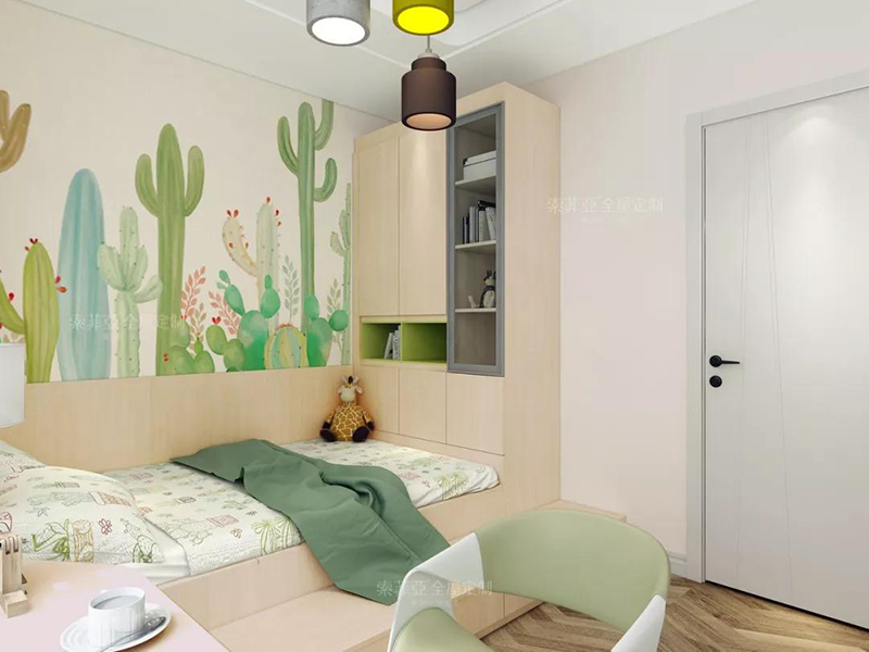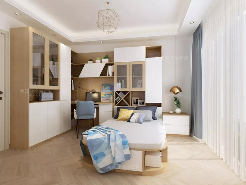 榻榻米床、衣櫃和組合櫃一體化,保證了設計的整體感。功能多樣而且實用,無論是用作書房還是臥室都無懈可擊。