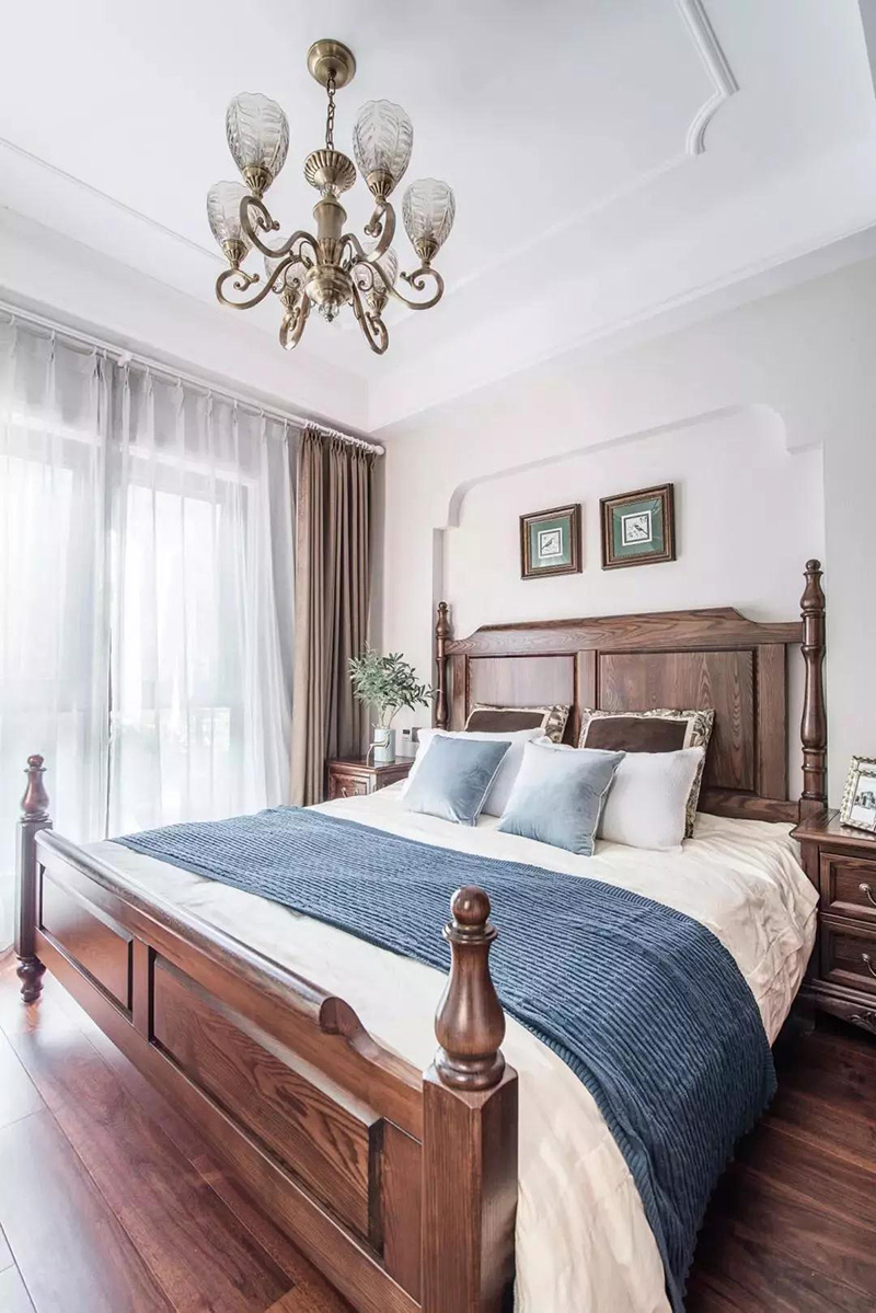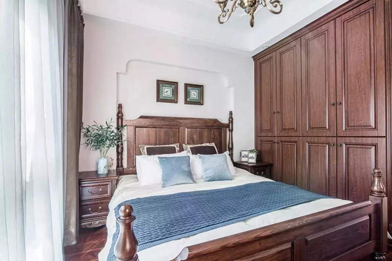 厚重的棕色系家具配色非常沉穩,搭配同色系羅馬柱實木床,瞬間提升了臥室的高貴感。