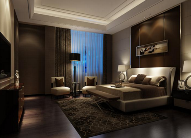 純黑色的整體衣櫥,配上絢麗的吊燈,使整個房間顯得低調而奢華。橙色在點綴其中,打破了原有的沉悶感,給整個臥室帶來注入了活力。