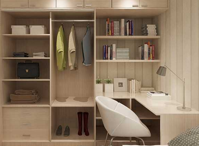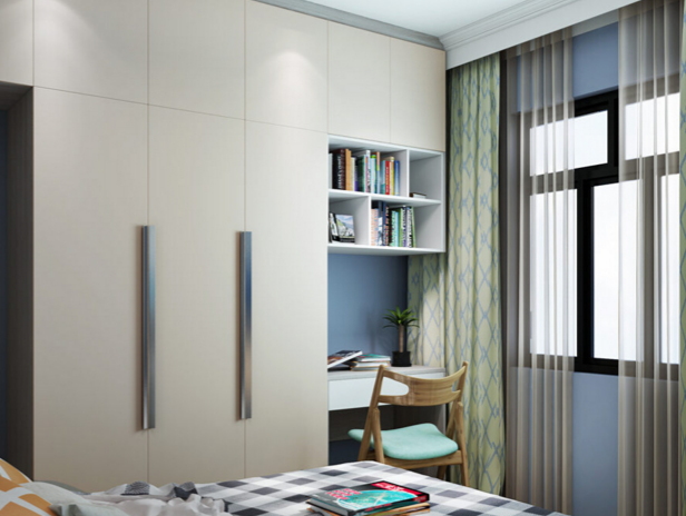 1、書桌並非只有一個用處,偶爾還能充當梳妝天。衣櫃帶書桌效果圖中的床鋪背后,還置有一排壁櫃,下方留出當做裝飾擺臺,靠近衣櫃的一端用作梳妝臺或辦公桌,也是十分方便。