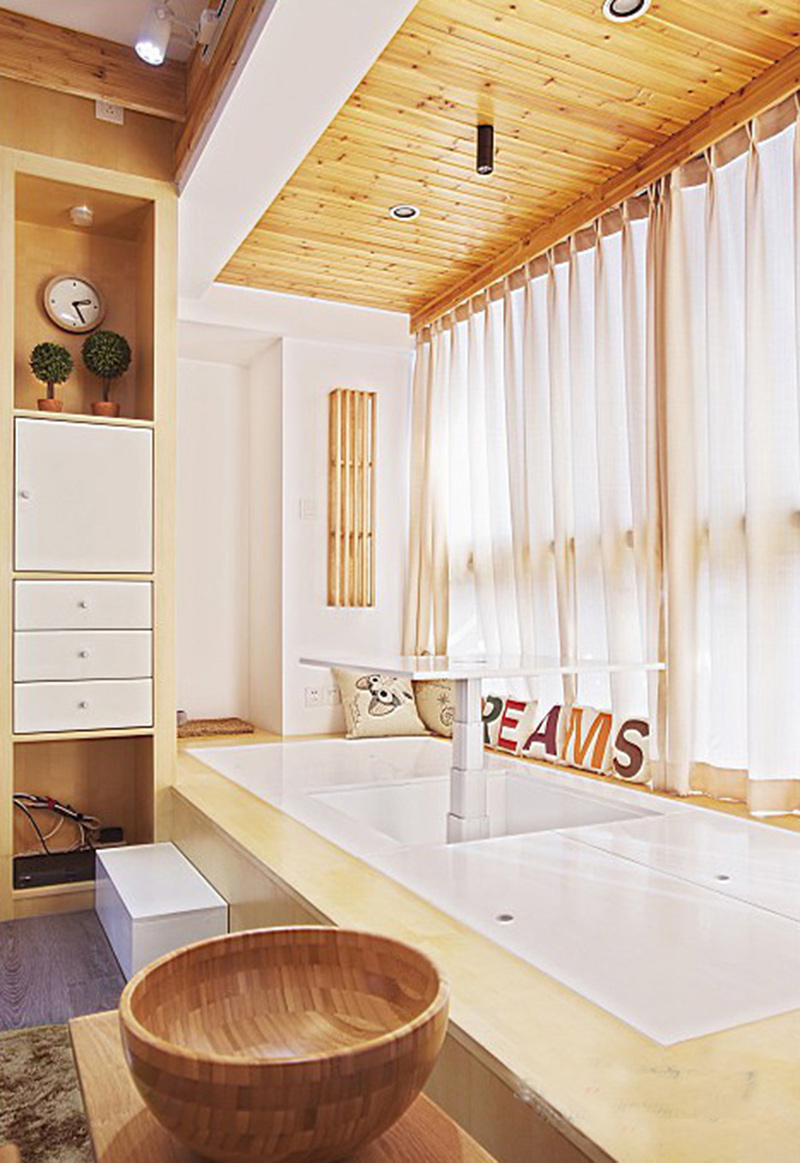 ▲較小的空間中加入榻榻米,是最明智的選擇。實木地板切出弧面,做成階梯狀,不僅實用,而且頗具藝術。