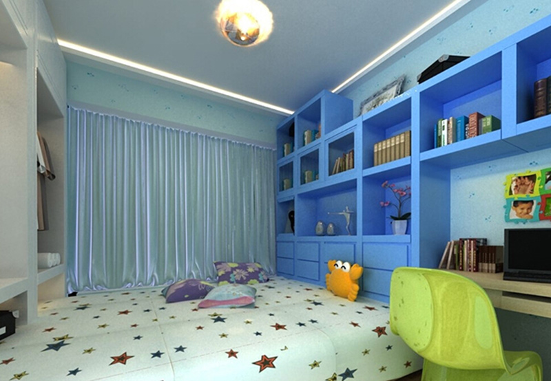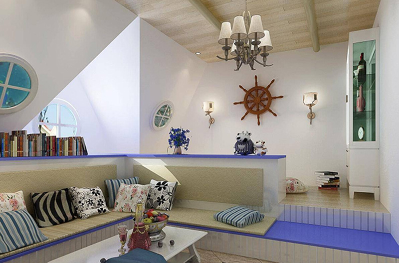 ▲床的前端裝上櫃子,不僅具有縮小空間占用,還具有強大收納功能。藍白地中海色彩相間,頗具有異域風情。