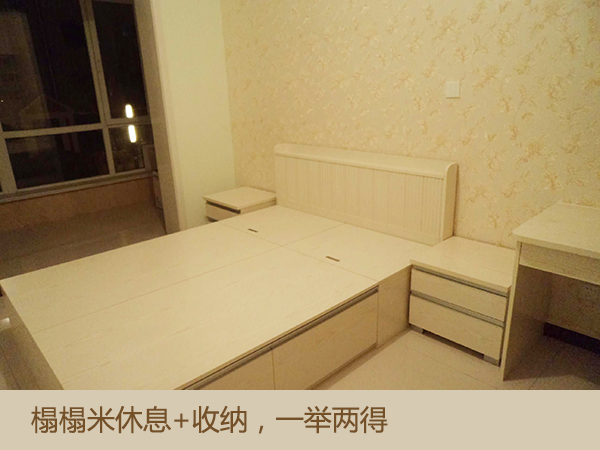 詹小姐臥室采用的是榻榻米床,榻榻米既可以像板床一樣有可休息的功能,同時還具有強大的收納能力,分格子有利于有序收納,既可以收納家中雜物,又可以收納不應季衣物,功能多多。
