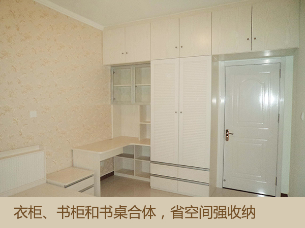 衣櫃+書櫃+書桌連體設計,節省家具占用的空間;櫃體頂到底,充分利用向上的空間,同時櫃體分格較多,便于日常有序收納。