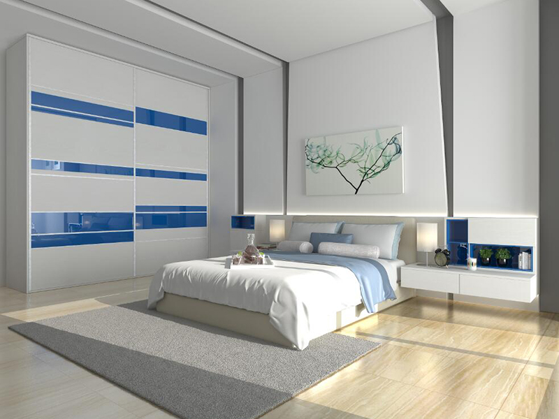 大面積的白色板材營造了一份簡潔、純凈、自然的氛圍。床頭背景墻采用內嵌式設計,很好的利用了墻面空間,強大的儲物功能,既是書櫃也是展示櫃和儲物櫃。整體設計簡約、時尚、大氣。
