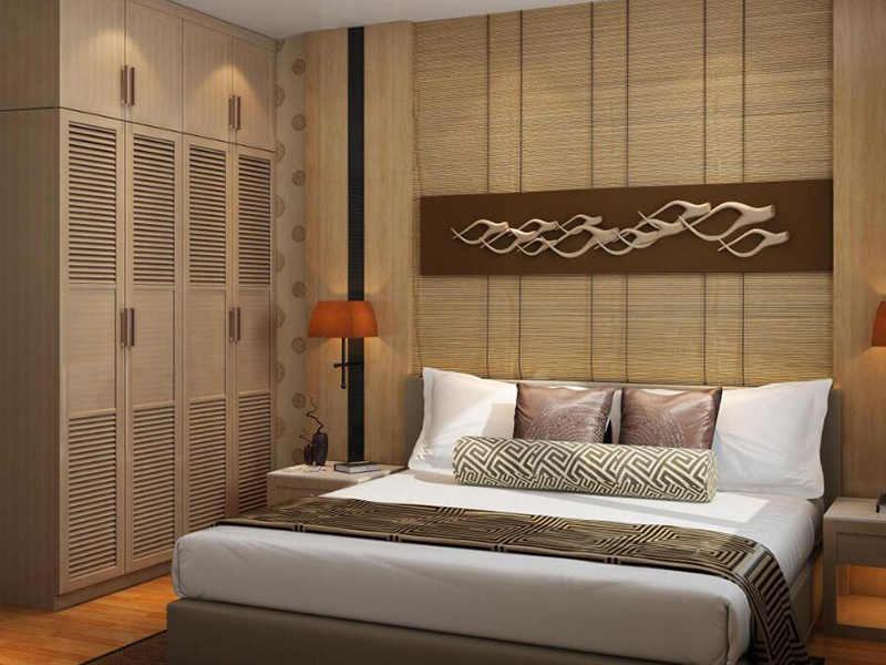 深紅色木質板材,將整個臥室裝扮的低調而尊貴。床頭背景墻采用木板和玻璃相結合,錯落有致。用板材的質感和玻璃的通透感,打造了一個極具特色,富有個性的床頭背景墻。