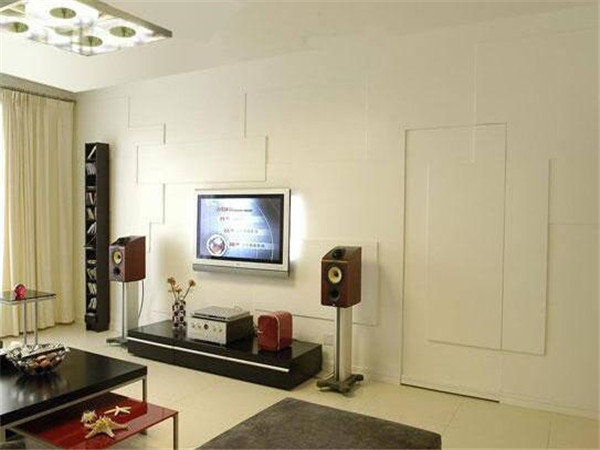 如果在電視墻旁邊開一扇門的話,會影響到整體的美觀性,因此主人采用了暗門的設計,由于暗門沒有其余的門框和門把設計,而且被裝飾上與背景墻一樣的飾品,使暗門和整個客廳的風格完美結合在一起,既起到裝飾作用,又遮擋了衛生間在視覺效果上的不足。